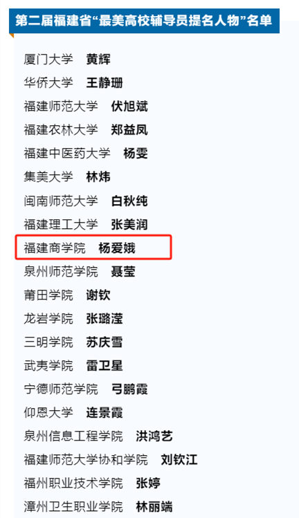日前,福建省委宣传部、省委教育工委公布第二届福建省“最美高校辅导员”“最美高校辅导员提名人物”名单。经学校推荐、专家评审,共评选出第二届福建省“最美高校辅导员”10名、“最美高校辅导员提名人物”20名。开云官网辅导员杨爱娥荣获“最美高校辅导员提名人物”。