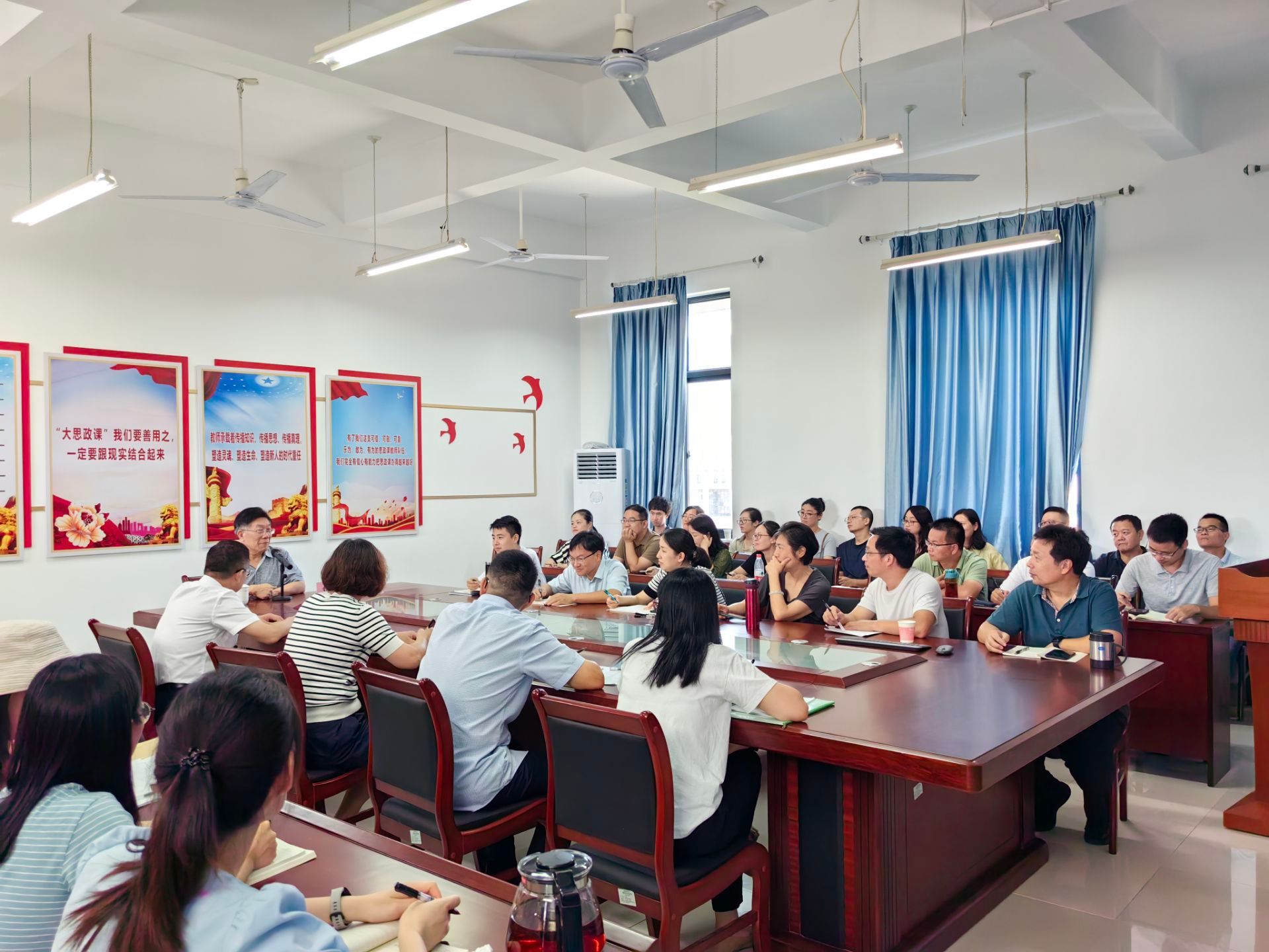 9月12日上午,刘书林教授以“如何当好一个受学生欢迎的思政课教师”为题,结合个人的求学、工作、生活经历,向马克思主义学院全体教师作经验分享,并提出五点建议。一是通读马克思主义经典原著,夯实马克思主义理论基础,增强课堂学理性;二是坚定马克思主义信仰,课堂内外理直气壮地宣传新时代中国特色社会主义思想;三是弘扬中华优秀传统文化,打开历史视野,引经据典,丰富课堂内容;四是善于利用个人经历,与学生拉近距离,活跃课堂氛围;五是保持宽广胸怀与乐观心态,淡泊名利,以饱满的热情投入到每一堂课。