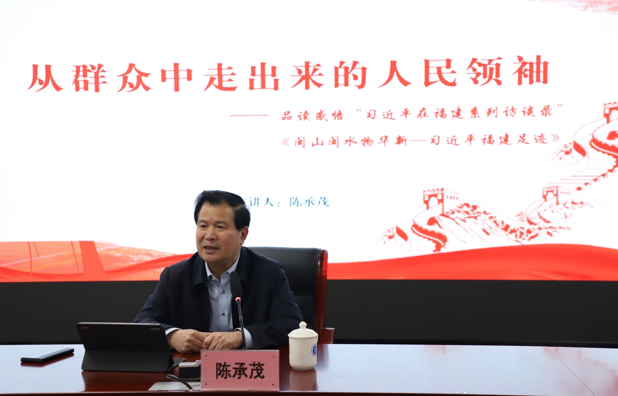 陈承茂以“从群众中走出来的人民领袖”为题,指出“两个确立”是党在新时代取得的重大政治成果,是推动党和国家事业取得历史性成就、发生历史性变革的决定性因素,对新时代党和国家事业发展、对推进中华民族伟大复兴进程具有决定性意义,结合学习“习近平在福建系列采访实录”与《闽山闽水物华新——习近平福建足迹》,从“人民至上”和“自我革命”两个角度,讲述了习近平总书记在福建工作期间“四下基层”“公开机关单位电话”“三进下党”等工作实践和共产党人“敬畏”“慎独”的优良品质,阐明了习近平总书记“我将无我”的人民情怀的深刻内涵;以“知行合一”的古为今用为切入点,结合“马上就办、真抓实干”“滴水穿石”“淡化贫困意识”“弱鸟先飞”“经济大合唱”等哲学格言,精细地剖析了习近平总书记在福建工作期间,开创的一系列重要理念和重大实践中蕴含的“知行合一”的哲学品格。