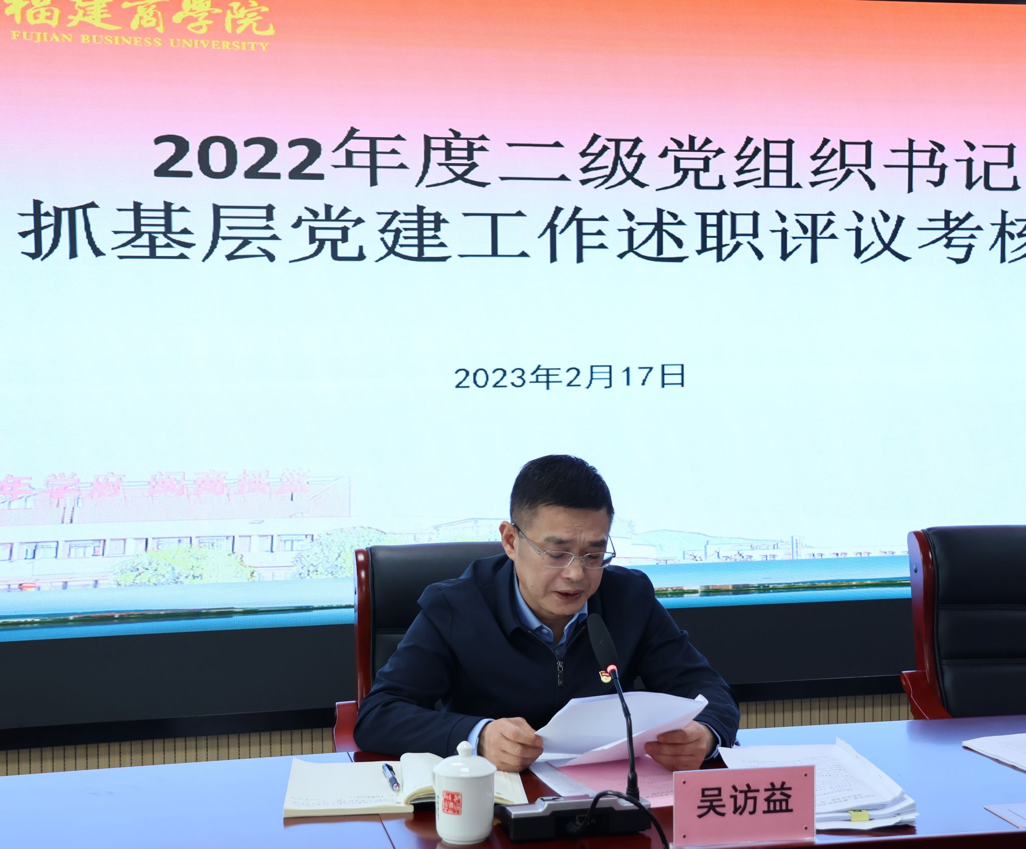 2月17日下午,开云官网2022年度二级党组织书记抓基层党建工作述职评议考核会在连江校区举行。全体在家校领导、机关党群部门负责人、二级学院党政负责人、人大代表、政协委员代表、学生代表等参加会议。会议由校党委副书记徐晓丹主持。