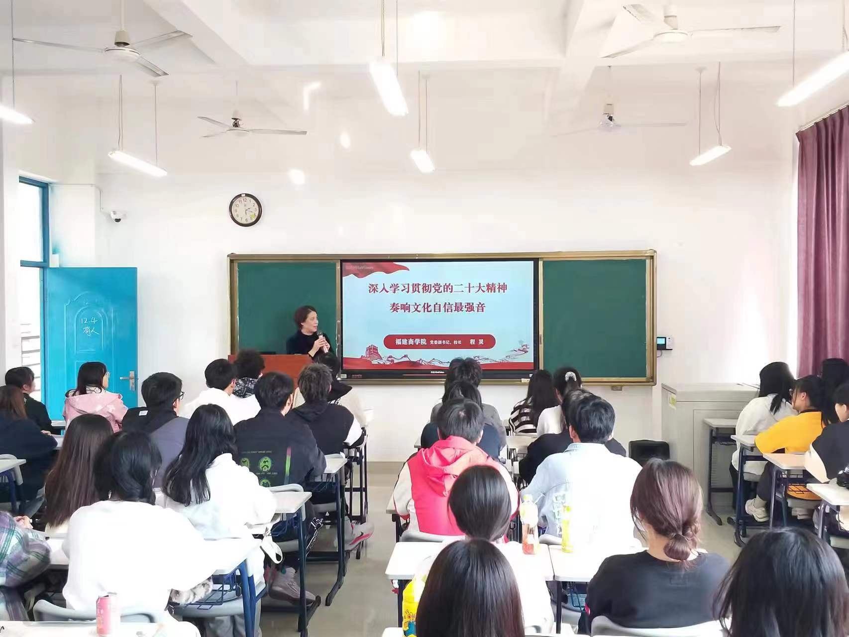 校长程灵以“深入学习贯彻党的二十大精神,奏响文化自信最强音”为题,为2021级旅游管理与服务教育班和2022级网络与新媒体班的同学们讲授专题党课。程灵以九个“深刻领会”带领同学们认真学习了党的二十大精神的核心要义与重大意义。围绕“奏响文化自信最强音”,程灵深入阐述了文化的概念、文化自信的内涵、文化自信的意义,以抢答互动+逐题解读的方式带领同学们全面学习领会党的二十大精神,并就如何增强“文化自信自强与当代青年的文化自觉”,向同学们提出了三点希望。一要深刻领会和主动践行中国特色社会主义先进文化;二要努力增强和积极扩大中华文明传播力、影响力;三要主动融入并积极建设福商校园文化。