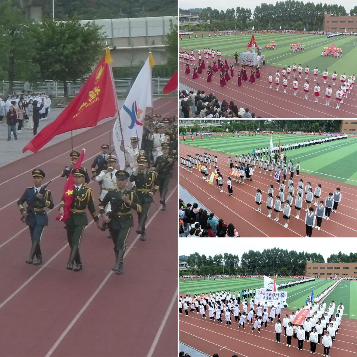 入场仪式庄重热烈,国旗、校旗、会徽方阵,彩旗队、裁判队、各二级学院代表队和机关代表队身着整齐的服装,英姿飒爽、朝气蓬勃,喊着整齐响亮的口号,迈着坚毅的步伐,依次通过主席台,并进行了精彩纷呈的入场式展演。