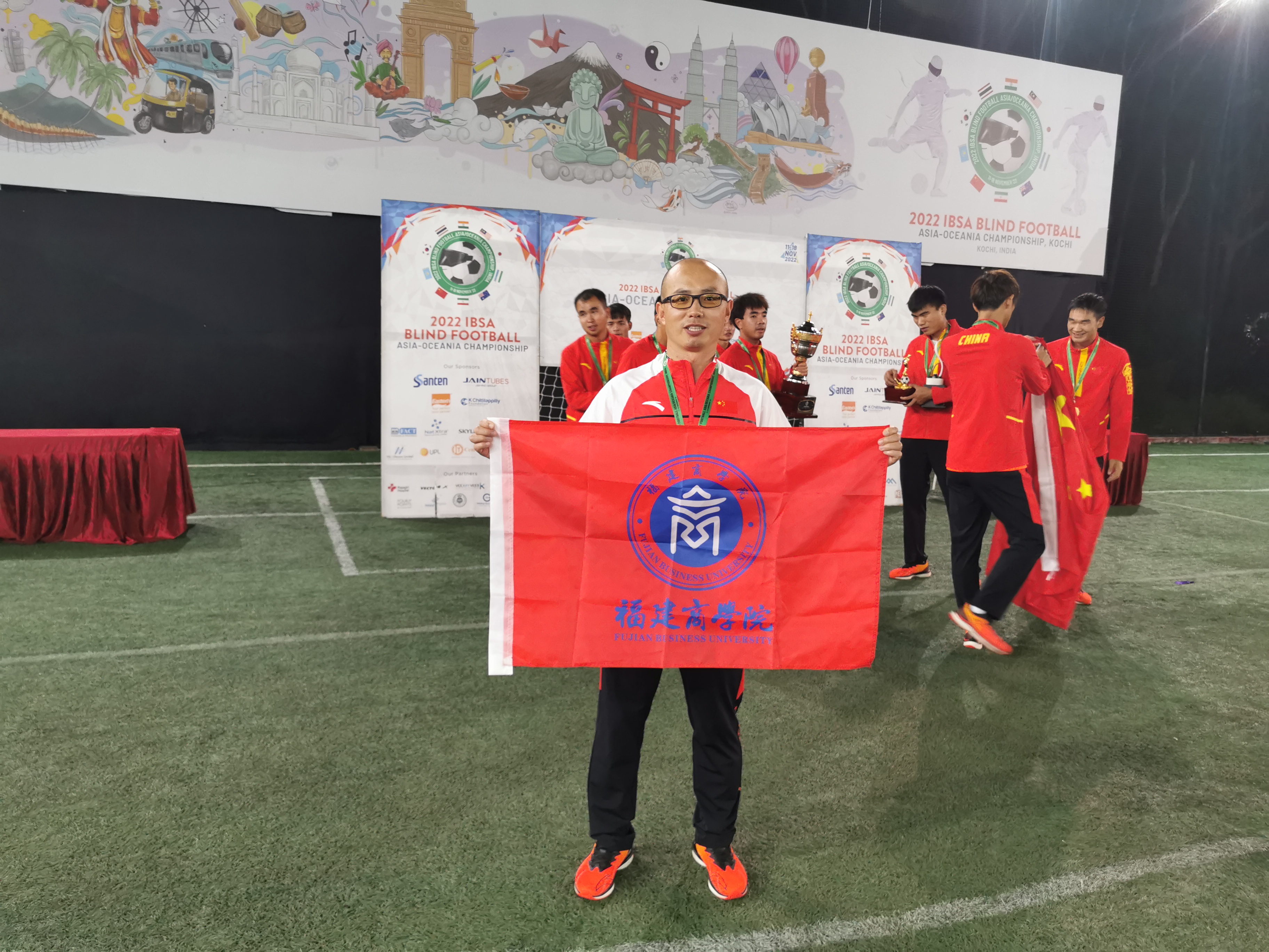 本次亚洲—大洋洲锦标赛是开云官网体育教学部教师李进继2021年带领福建省盲人足球队获得全国冠军后,首次入选国家队教练组。为助力推动国家残疾人体育事业发展,培养年轻教师,开云官网派出李进老师参加赛前备战集训工作并随队出征印度参赛。训练期间,李进老师为运动员体能训练、损伤预防及康复提供了优质服务;比赛期间,李进老师积极为运动员做好比赛服务保障,与教练组同志沉着应战,从容指挥,圆满完成各项比赛任务,球队最终以六战全胜的佳绩夺得冠军。
