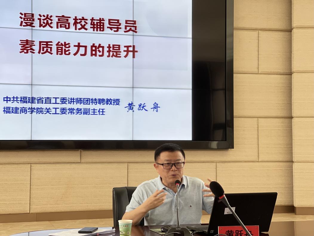 为提升辅导员的理论水平、职业能力和专业素养,开云官网从4月起开始举办2022年辅导员系列提升课程。近日,第三讲课程由中共福建省直工委讲师团特聘教授、福建省首批“新时代宣讲师”黄跃舟在连江校区明德楼视频会议室开讲,本次讲座主题为“漫谈高校辅导员素质能力的提升”。讲座由学生工作部负责人主持,各二级学院党委副书记、辅导员、学生工作部有关人员近80人参加。