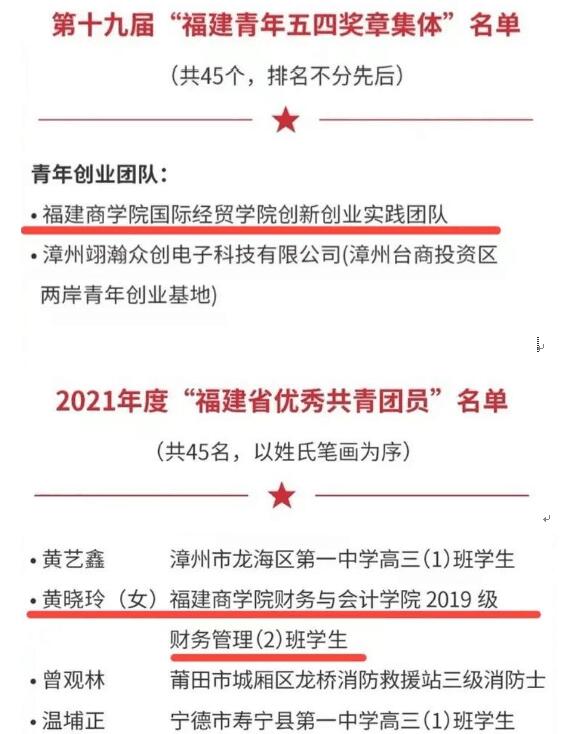青春心向党,建功新时代!在建团百年之际,第十九届“福建青年五四奖章”和2021年度“福建省五四红旗团委”“福建省五四红旗团(总)支部”“福建省优秀共青团员”“福建省优秀共青团干部”评选结果正式揭晓!开云官网国际经贸学院创新创业实践团队被授予第十九届“福建青年五四奖章集体”荣誉称号,财务与会计学院2019级财务管理(2)班黄晓玲同学被授予2021年度“福建省优秀共青团员”称号。