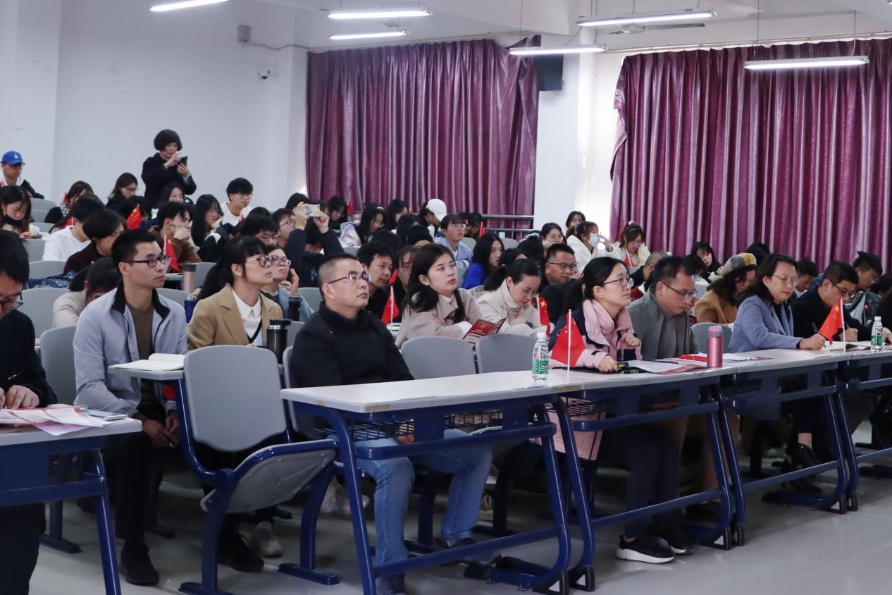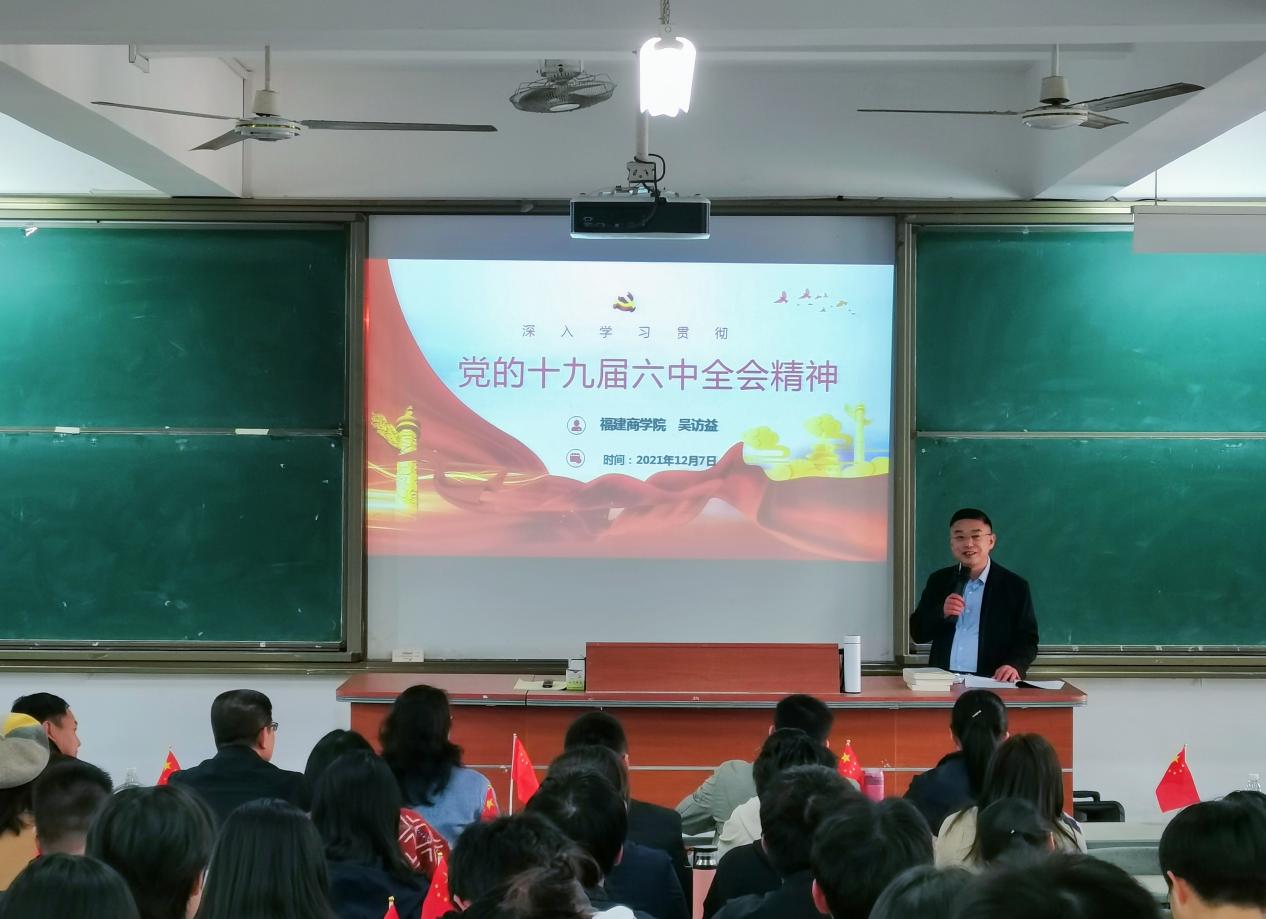 12月7日下午,校党委副书记吴访益在连江校区诚信楼中阶4教室作题为“深入学习贯彻党的十九届六中全会精神暨学习福建省第十一次党代会精神”的主题宣讲,有关处室负责人、马克思主义学院全体教职工、校习近平新时代中国特色社会主义思想读书社全体成员共120多人参加了宣讲会。