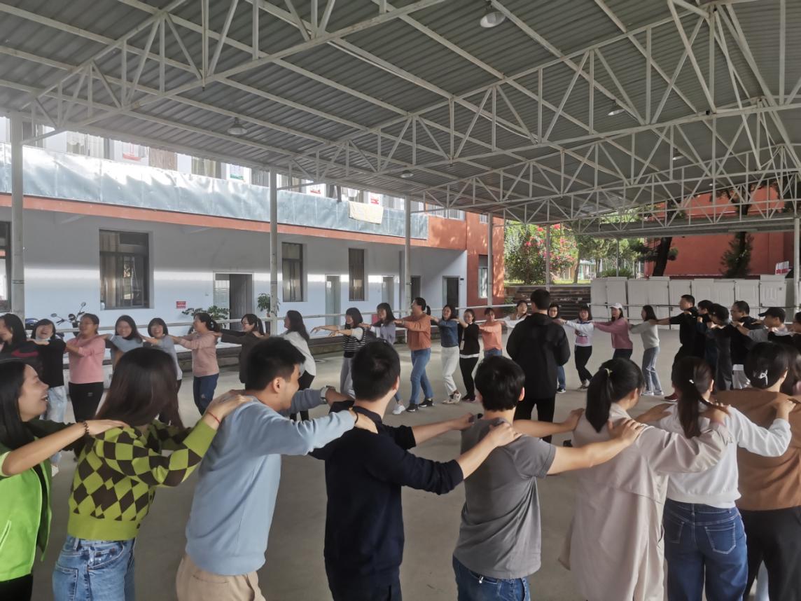 活动中,在教练的带引下,全体参训辅导员组成六队,并为自己的队伍取队名、立口号、建队形。各团队合理分工、团结协作,顺利完成了“桃花朵朵开”“轨道传球”“摩天大楼”“超级电脑”“不倒森林”等系列趣味游戏,活动现场气氛热烈,参赛人员情绪高昂,在笑声和掌声中缓解疲劳,在合作中体验团队精神。