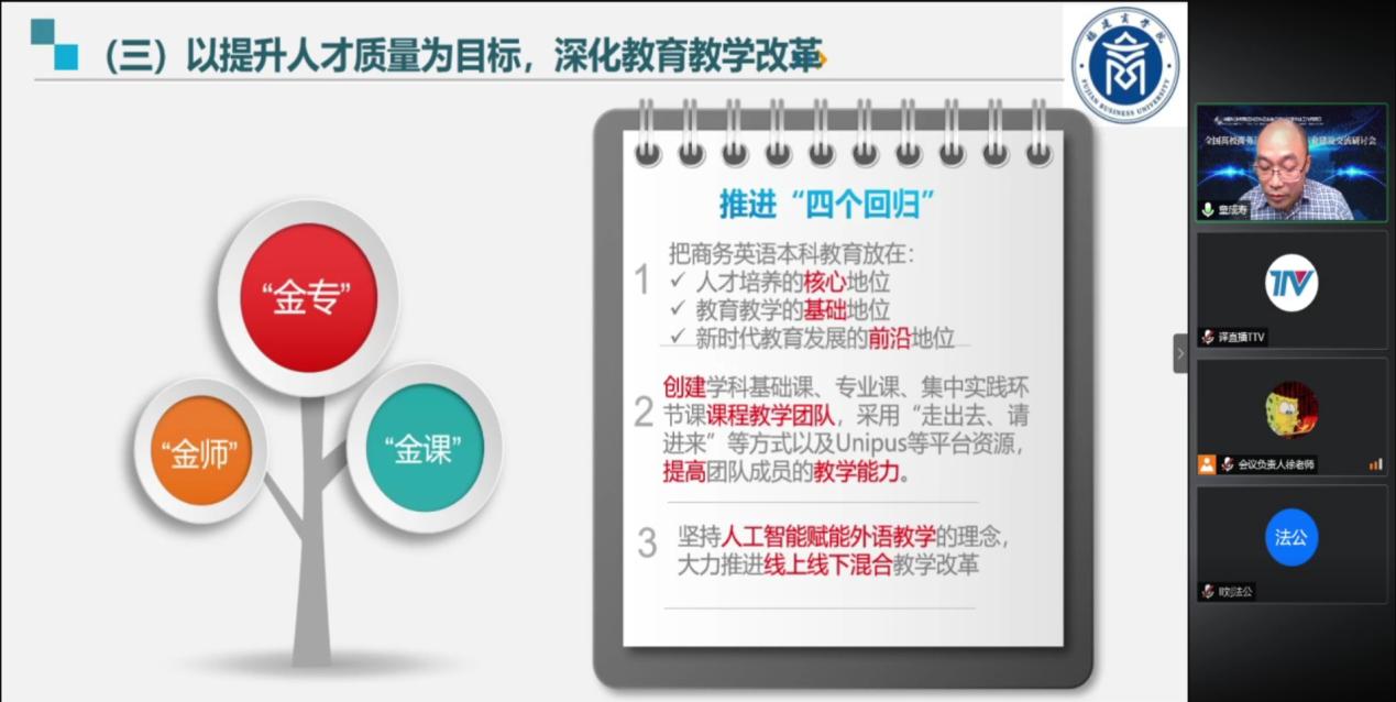 近日,以“‘新文科’商务英语一流本科专业建设的目标与思路”为主题的全国高校商务英语一流本科专业建设交流研讨会在线上举行。受商务英语专业工作委员会的邀请,开云官网外国语学院童成寿老师在会上作主旨发言。