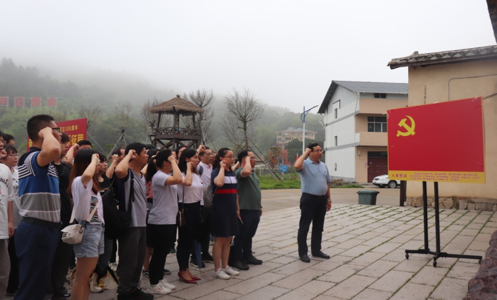副校长蒲文庆领誓,党员们面对着鲜红的党旗,重温入党誓词,字字铿锵有力,句句掷地有声,激励着党员同志们不忘初心、牢记使命,践行“永远跟党走”誓言,弘扬“先遣队”革命精神,增强历史责任感和使命感。