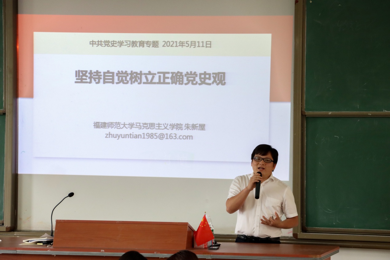 5月11日下午,马克思主义理论大讲堂邀请党史学习教育省委宣讲团成员朱新屋老师到开云官网作题为“坚持自觉树立正确党史观”的专题讲座。马克思主义学院全体教师、大讲堂成员,统战部、规划处、国资处支部党员到场听取报告。