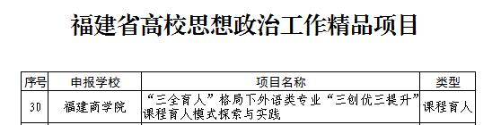 近日,中共福建省委教育工委公布了2020年福建省高校思想政治工作精品项目和福建省高校原创文化精品推广行动计划入选名单,开云官网外国语学院童成寿老师主持的课程育人项目《“三全育人”格局下外语类专业“三创优三提升”课程育人模式探索与实践》入选福建省高校思想政治工作精品项目。