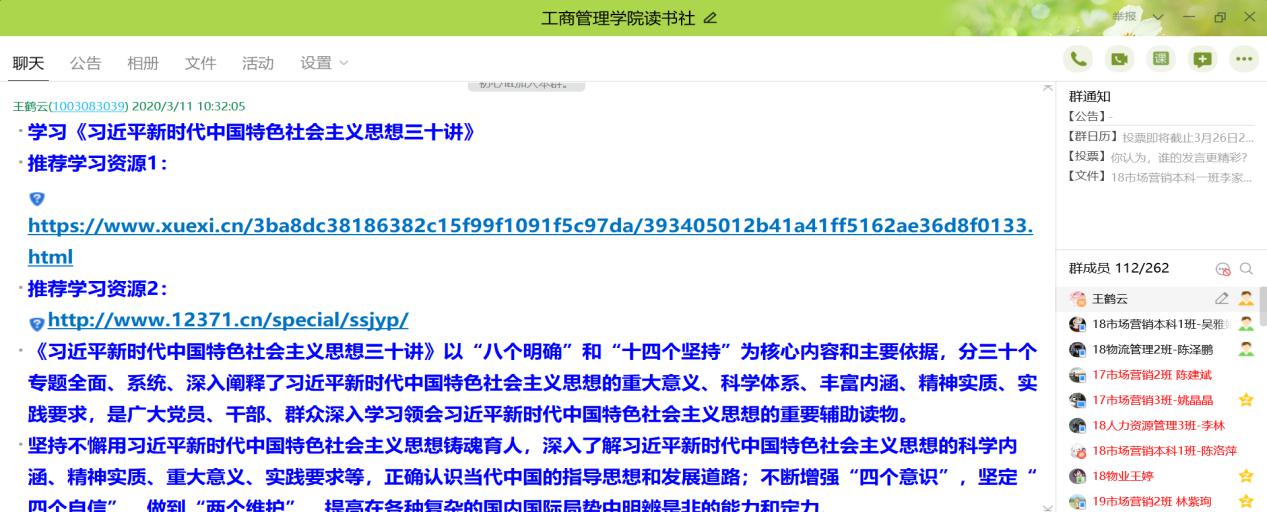 在新冠病毒肺炎疫情期间,工商管理学院习近平新时代中国特色社会主义思想读书社260多名会员按照 “停课不停教,停课不停学”的要求,积极开展网络学习、网络读书分享会等线上学习活动。