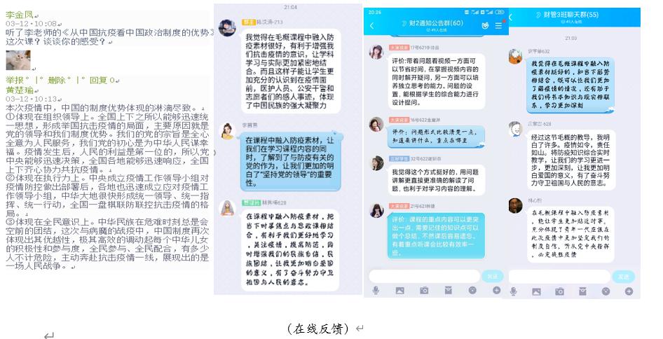 在线讨论互动,答疑解惑启迪学生,深化认识提升教学的针对性。教师们结合疫情防控系列专题,认真思考如何用好疫情“教科书”,围绕抗击疫情中的典型案例,引导同学们在线对“武汉封城”“疫情大考”“党的领导”“制度优势”“中国力量”“青年的责任与担当”等热点问题展开讨论。