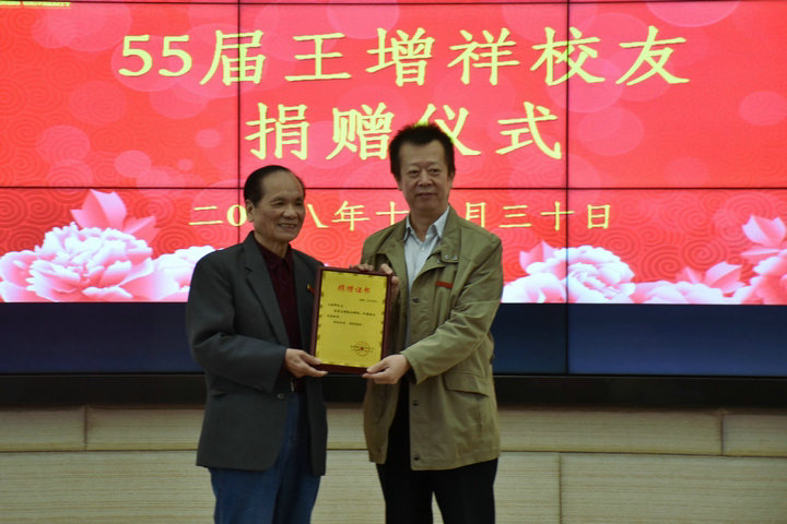 刘剑津书记向王增祥校友颁发捐赠证书