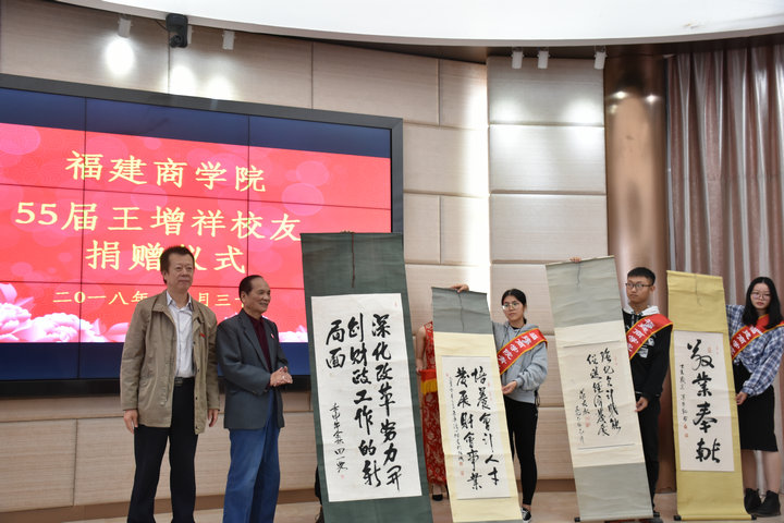 捐赠仪式上,王增祥向学校捐赠国家财政部原领导、福建省原领导以及福建省财政厅原领导对财政工作的四副题词。刘剑津代表学校接受捐赠,向王增祥校友颁发捐赠证书,并向莅临学校的校友赠送kaiyun开云官方网站校徽。