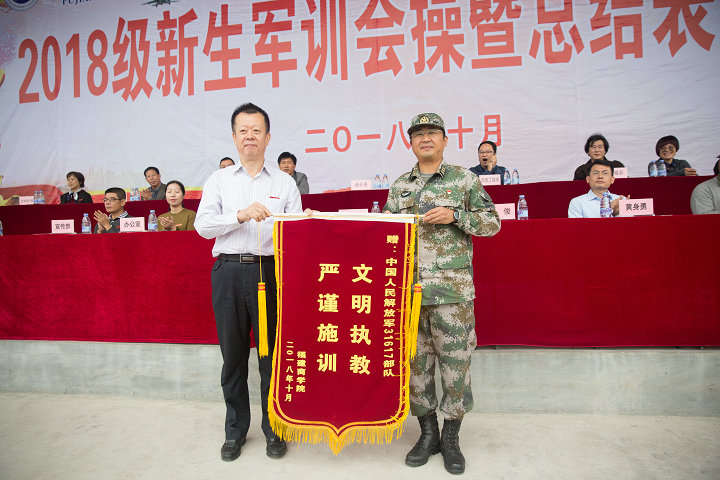 会操完毕后,校党委书记刘剑津代表学校向承训部队赠送锦旗。校军训工作领导小组为受表彰的单位、优秀辅导员、军训标兵代表颁发了奖牌和证书。