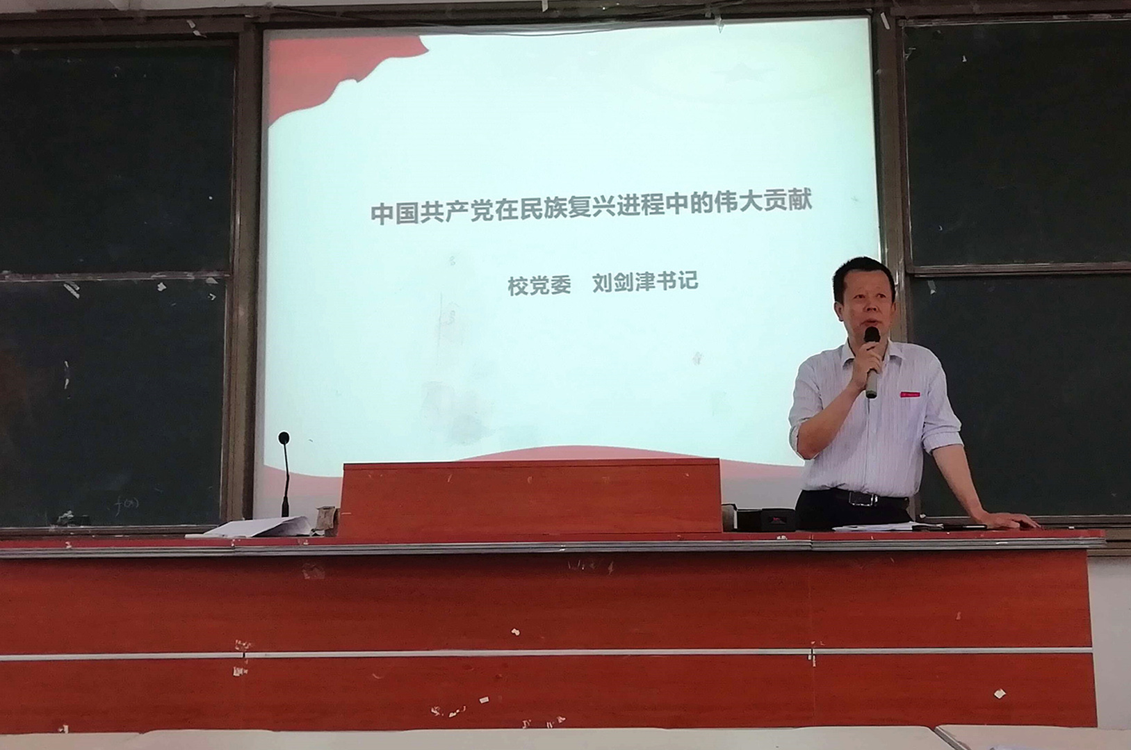 6月3日下午,校党委书记刘剑津在连江校区诚信楼中阶2教室,为学生讲授了一堂《中国共产党在民族复兴进程中的伟大贡献》思想政治理论课,100多名学生参加了学习。
