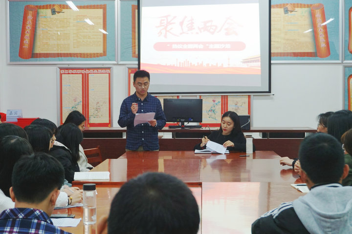 2019年全国“两会”期间,读书社师生积极通过不同形式持续关注“两会”动态。“两会”结束后,同学们热情不减,认真学习“两会”精神,自觉以“两会”精神指导学习和实践。交流会上,读书社师生一起观看了“两会青年奋斗说”专题片,分别就各自关注的减税降费、脱贫攻坚、医疗卫生、蓝天保卫战、教育与就业等热点问题发表了自己的看法。大家普遍认为,今年的《政府工作报告》展示了一个更加开放、自信的中国,十分鼓舞人心,更是倍感幸福,其中涉及教育、创新创业、就业等方面的内容更是与每位同学息息相关,大家都倍加关切。大家表示,作为新时代大学生,要进一步提振精气神,努力学习,不断提高自我修养和能力,积极准备着为社会主义现代强国建设贡献力量。交流过程中,同学们踊跃发言,老师们积极引导、耐心点拨,师生共同研讨,思想交流碰撞,其乐融融。