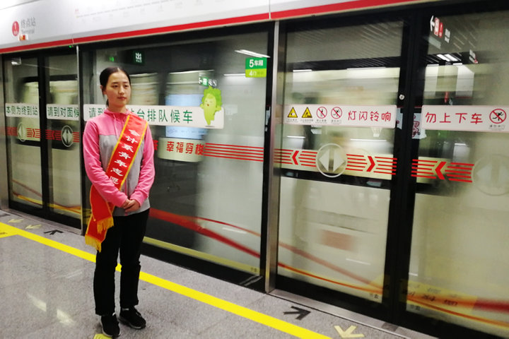学生志愿者在地铁站台开展客流引导服务
