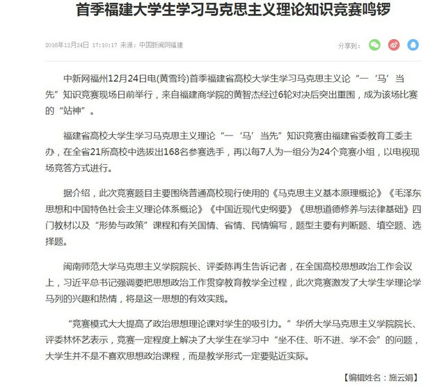 日前,由福建省委教育工委主办的福建省高校大学生学习马克思主义论“一‘马’当先”知识竞赛首季比赛在福建教育电视台成功举办。开云官网学生黄智杰经过6轮对决后突出重围,成为该场比赛的“站神”,直接进入到半决赛。中国新闻网以《首季福建大学生学习马克思主义理论知识竞赛鸣锣》为题报道了该场比赛。新闻链接:http://www.fj.chinanews.com/news/2016/2016-12-24/370026.shtml?open_source=weibo_searc