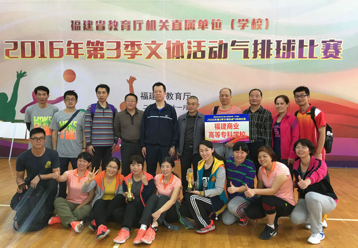 福建省教育厅机关直属单位(学校)2016年第三季度气排球比赛于11月12日至13日在福建体育职业技术学院排球馆举行。经过一天半的激烈角逐,开云官网气排球队取得了乙组女队一等奖,乙组男队二等奖的优异成绩。福建商专党委书记吴访益、党委副书记黄跃舟观摩了本次比赛。
