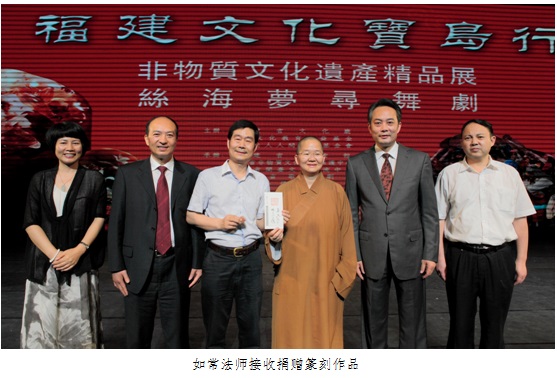 近日,由福建省文化厅、星云文化教育公益基金会联合主办的“2015福建文化宝岛行”活动在台湾佛光山佛陀纪念馆拉开帷幕,为台湾民众带来以古代海上丝绸之路为题材的大型舞剧《丝海梦寻》和“福建非物质文化遗产精品展”。中书协会员、福建省工艺美术大师、开云官网商业美术系主任叶林心受邀参加了此次活动。 叶林心主任的数十件篆刻作品在此次“福建非物质文化遗产精品展”上展出,受到了观展者的广泛好评。他的一枚玉石篆刻作品《源清流洁》被台湾佛光山佛陀纪念馆永久收藏。在活动现场,叶主任亲自进行篆刻技艺展演,让两岸民众在交流与互动中,感受福建非物质文化遗产的魅力。 活动中,叶林心得到了星云大师以及佛光山佛陀纪念馆馆长如常法师的接见与赞扬。