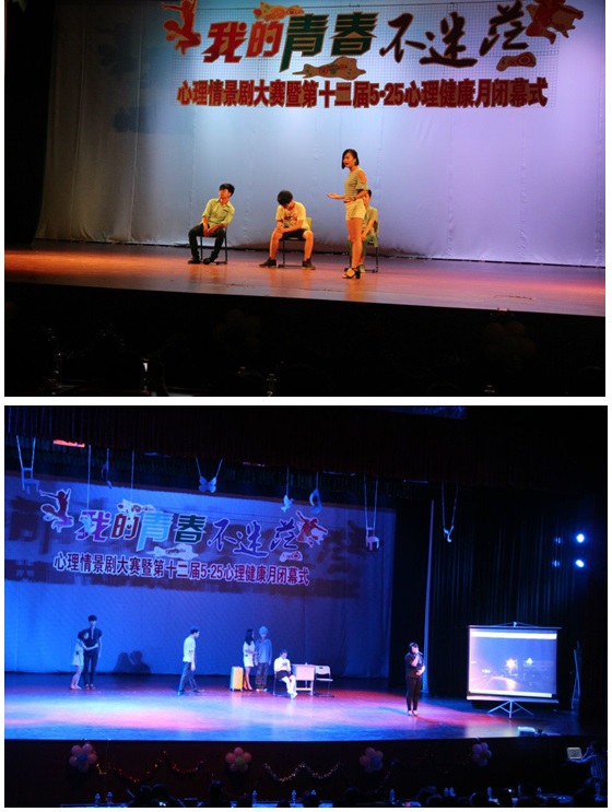 随着情景剧比赛的落幕,本届525心理健康月活动也圆满地划上了句号。本次525心理健康月系列活动从5月6日正式启动,历时近一个月时间,相继开展了心灵涂鸦、户外心理素质拓展、心理主题班会、专家心理讲座及情景剧大赛等一系列形式多样、丰富多彩的活动。各系认真组织同学积极参与到了各项活动中,在校园里形成了一片人人关爱自我、关爱他人、关注心理健康的和谐氛围。