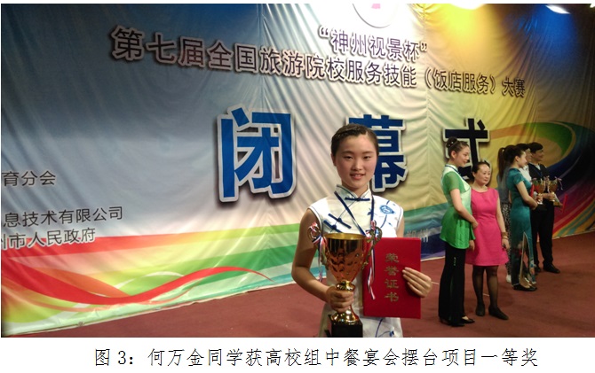 开云官网旅游系选派13级酒店管理1班何万金同学参加高校组中餐宴会摆台项目,该项目有来自140所高等院校的140名选手参加。经过紧张而激烈的角逐,何万金同学总成绩位列第9名,喜获高校组中餐宴会摆台项目的一等奖(一等奖共13名)。