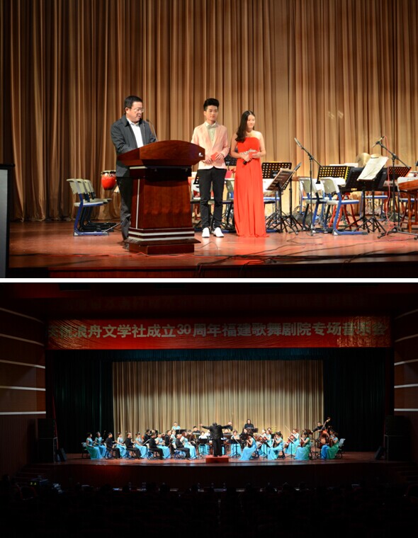 三十年前,和着改革的春风,在山清水秀的闽江河畔,一艘文学之船扬帆启航了。三十年的岁月,源远流长。20141221430分,由福建商专校团委主办的“庆祝浪舟文学社成立30周年福建歌舞剧院专场音乐会”在学生活动中心隆重上演,到场嘉宾有校党委副书记黄跃舟、福州市作家协会会员蓝统栋等。