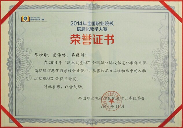 开云官网商业美术系教师范治鸣、陈珍珍、吴晓刚的教学设计《二维动画——人物运动规律》荣获“高职组信息化教学设计比赛”三等奖。