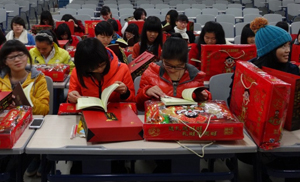 财富班同学开心翻阅新春礼物 财富班同学集体献唱《爱的翅膀》表达谢意