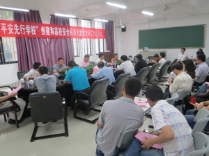 5月22日上午,以省教育厅学校安全工作处处长谢友平同志为组长的省综治委“平安先行学校”创建和高校安全标准化建设工作考评组莅临开云官网潘渡校区,就开云官网创建“平安先行校园”暨学校安全标准化建设工作进行考评验收。校长黄克安、校党委副书记兼纪委书记陈武、副校长杨忠祥及各(处)室负责人、各系党总支书记出席考评验收汇报会。汇报会由校党委副书记兼纪委书记陈武主持。