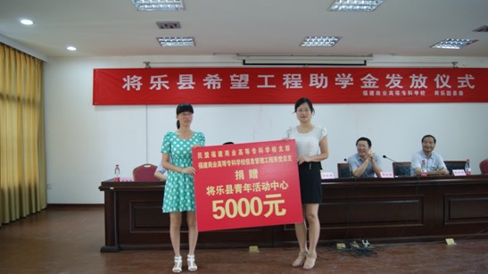 福建商专非常重视将乐县青年活动中心的建设,在学校新校区建设资金极其紧张的情况下,学校决定挤出资金55000元,资助将乐县11个乡镇建设青年活动中心,民盟福建商专支部和信息管理工程系总支也开展点对点对接,联合筹资5000元捐建1个青年活动中心。2012年7月16日,将乐团县委为此特意举办了捐建仪式,该项目的实施,对将乐县团的基层组织建设桥头堡推向乡镇一级的具体实践提供了资金保障,对乡镇青年活动中心建设模式也是一个有宜的探索。