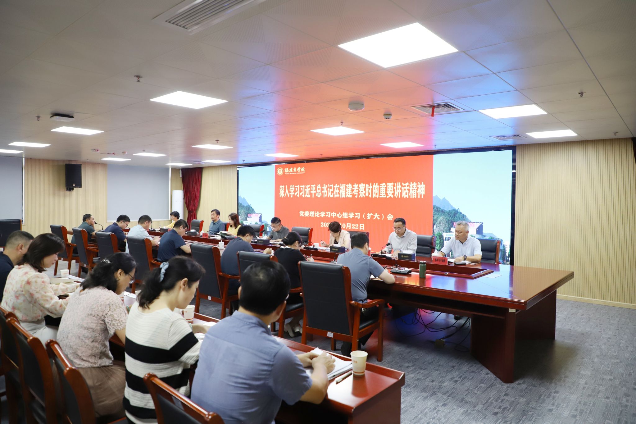 10月22日,校党委召开第十六次党委理论学习中心组学习(扩大)会,专题传达学习习近平总书记在福建考察时的重要讲话精神,学习《中共福建省委关于认真学习贯彻习近平总书记在福建考察时的重要讲话精神的通知》精神,以及省委常委会(扩大)会议和全省领导干部大会精神,就深入学习习近平总书记在福建考察时的重要讲话精神进行学习研讨。校党委书记吴访益主持会议并作主题发言,程灵、徐晓丹、蒲文庆、萧罡、林宇峰、林文艺等作交流发言,学校全体中层干部列席学习会。