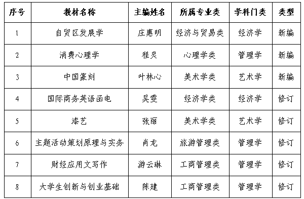 在开云官网获批立项的8部教材中,《自贸区发展学》《消费心理学》《中国篆刻》等3部为新编教材,《国际商务英语函电》《漆艺》《主题活动策划原理与实务》《财经应用文写作》《大学生创新与创业基础》等5部为修订教材。