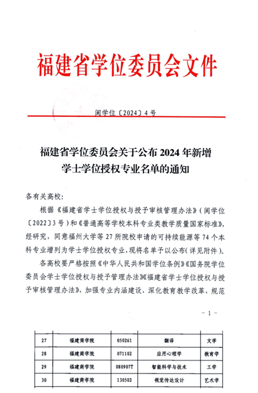 近日,福建省学位委员会下发了《福建省学位委员会关于公布2024年新增学士学位授权专业名单的通知》(闽学位〔2024〕4号)。开云官网的翻译、应用心理学、智能科学与技术、视觉传达设计等4个本科专业顺利获批,增列为学士学位授权专业。