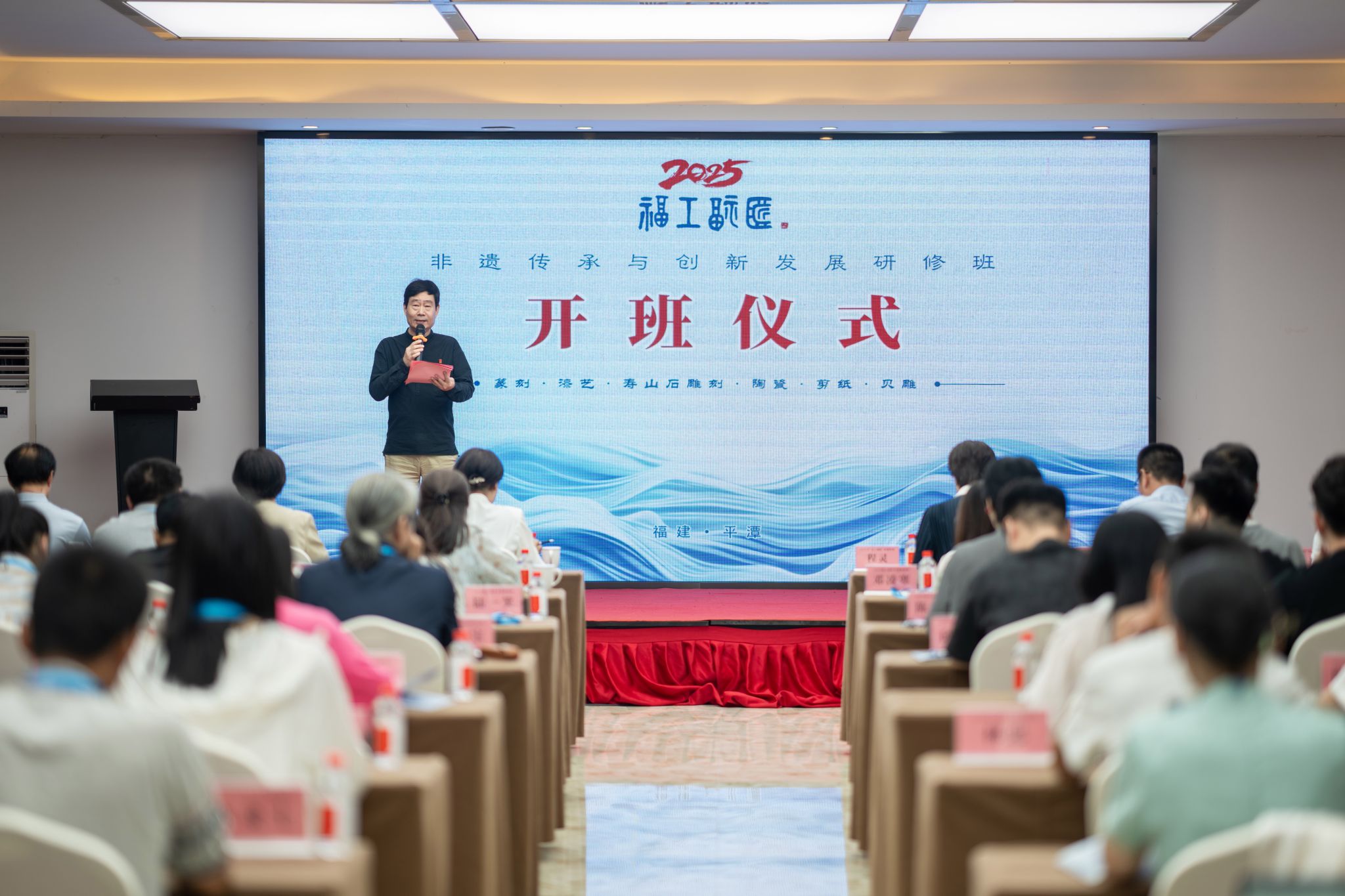 本次研修班由福建省文化和旅游厅指导,kaiyun开云官方网站、福建省艺术馆(福建省非物质文化遗产保护中心)、平潭综合实验区党工委宣传与影视发展部、平潭综合实验区旅游与文化体育局、平潭综合实验区文旅集团共同举办,爱在山水间旅游集团承办。研修班聚焦寿山石雕、陶瓷、漆艺、贝雕、篆刻等福建特色非遗项目,特邀行业专家组成导师团队,通过专题讲座、互动研讨、实地考察等方式,助力40余名传承人提升文化素养、深化技艺理解、增强传承实践能力。