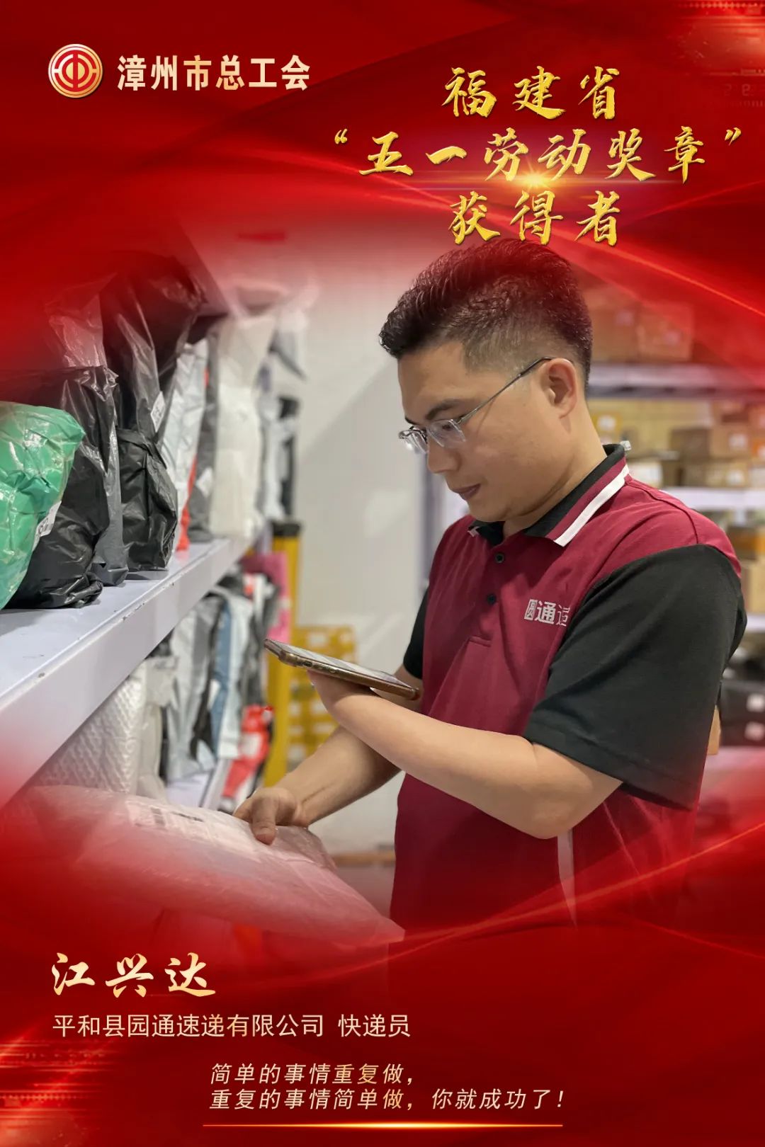 出生于1990年的江兴达,虽然先天左手掌缺失,但他没有被命运击倒,一路跌跌撞撞,敢拼会赢。大专毕业后,毅然放弃大城市工作机会,回到福建省漳州市平和县大溪镇,代理了圆通、顺丰、中通、极兔等4 家快递公司的业务。他借助东风,推动平和特色水果红美人、果冻橙、青枣等农产品进城,服务乡村振兴,被大家亲切地称为“阿达”。阿达扎根平和县偏远乡镇大溪镇,刚开始承办快递网点,一天业务量只有十几件,生意亏本。但他没有气馁,而是发愤图强、克服困难,每天起早摸黑,辛勤工作,后来开始收支平衡,现在每天平均收派快件达900多件。2020年,阿达成为漳州市首届十名“最美快递员”之一。