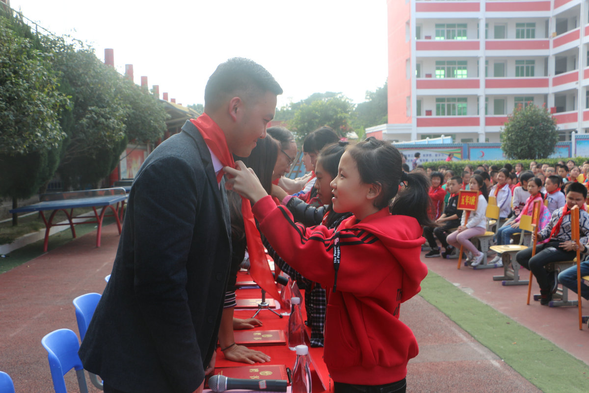 少先队员代表为到场领导佩戴红领巾