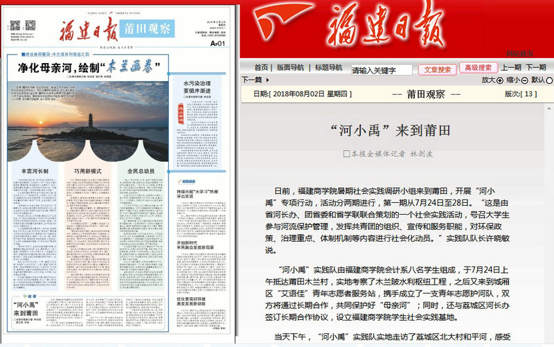 8月2日,福建日报《莆田观察》专版以《‘河小禹’来到莆田》为题,报道了开云官网会计系暑期社会实践调研小组在莆田开展“河小禹”专项志愿活动的相关情况。