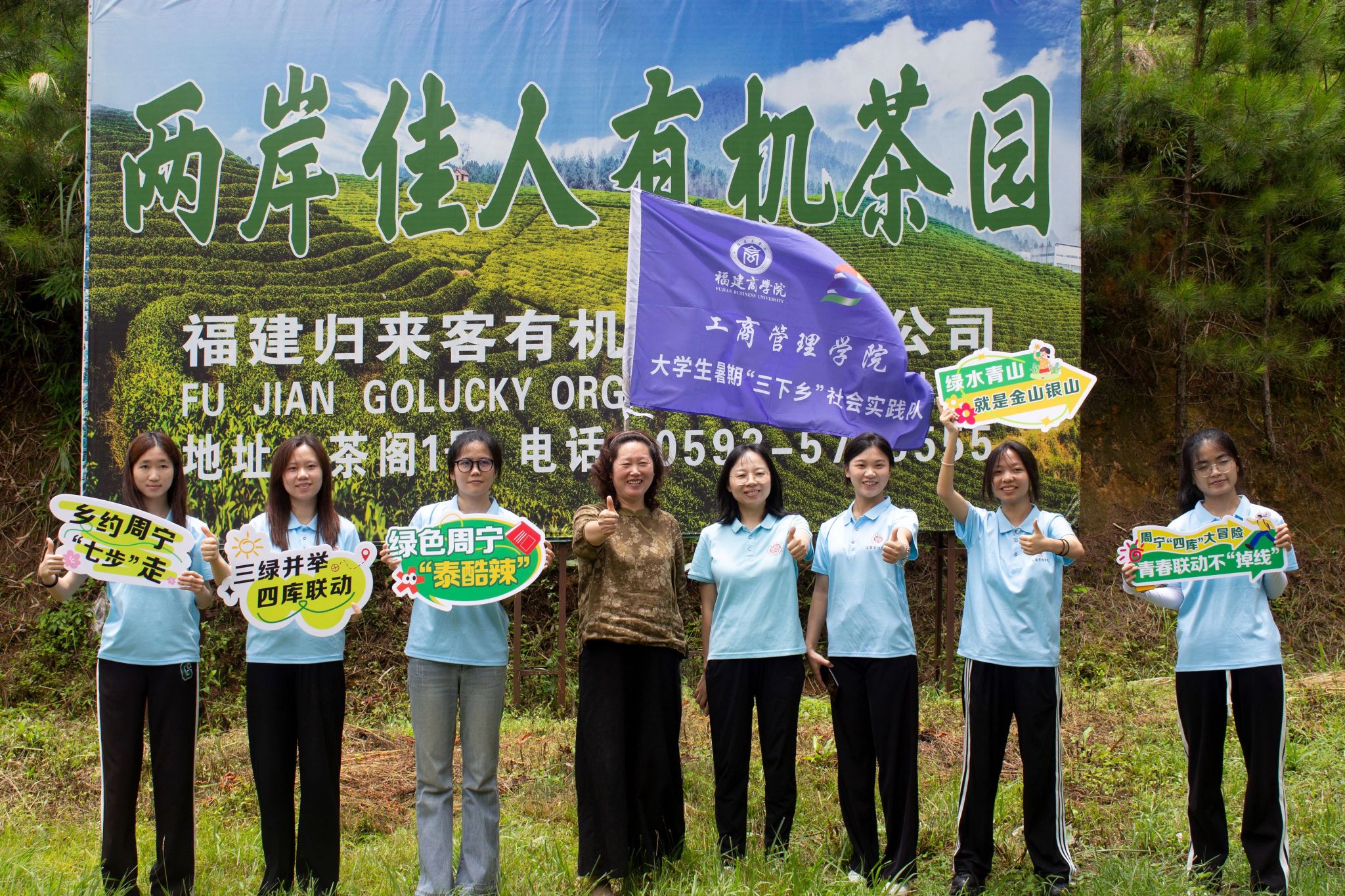 实践队走进福建归来客有机茶叶有限公司体验采茶、摇青、揉捻等制茶工艺,并借此机会深入了解周宁高山云雾茶品牌宣传推广案例。福建归来客有机茶叶有限公司依托地域资源优势,建设生态有机茶园,积极打造“两岸佳人”周宁高山云雾茶品牌,依托“企业+基地”模式,带动茶农增收,更以“两岸共饮一杯茶”的理念,让茶叶成为联结生态、文化与民生的绿色纽带。