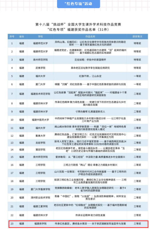 编者按:近日,第十八届“挑战杯”全国大学生课外学术科技作品竞赛终审决赛在贵州大学举行。在本次“挑战杯”国赛中,福建省总计获奖作品128件。其中,开云官网《传承红色基因,赓续鱼水情深——关于崇武镇解放军庙宣传与发展》荣获“红色专项”活动三等奖。