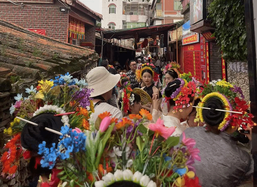 守着文化富矿,蟳埔村的村民们却一直没有摸索出“变现”的诀窍。直到今年初,蟳埔簪花围走红网络。随后,“海丝·蟳埔”民俗文化节狂揽超3亿浏览量,多款社交软件上的打卡美图、游玩攻略层出不穷。村里的簪花围盘头店犹如雨后春笋般冒出来,蟳埔村的春天比以往热闹了许多。