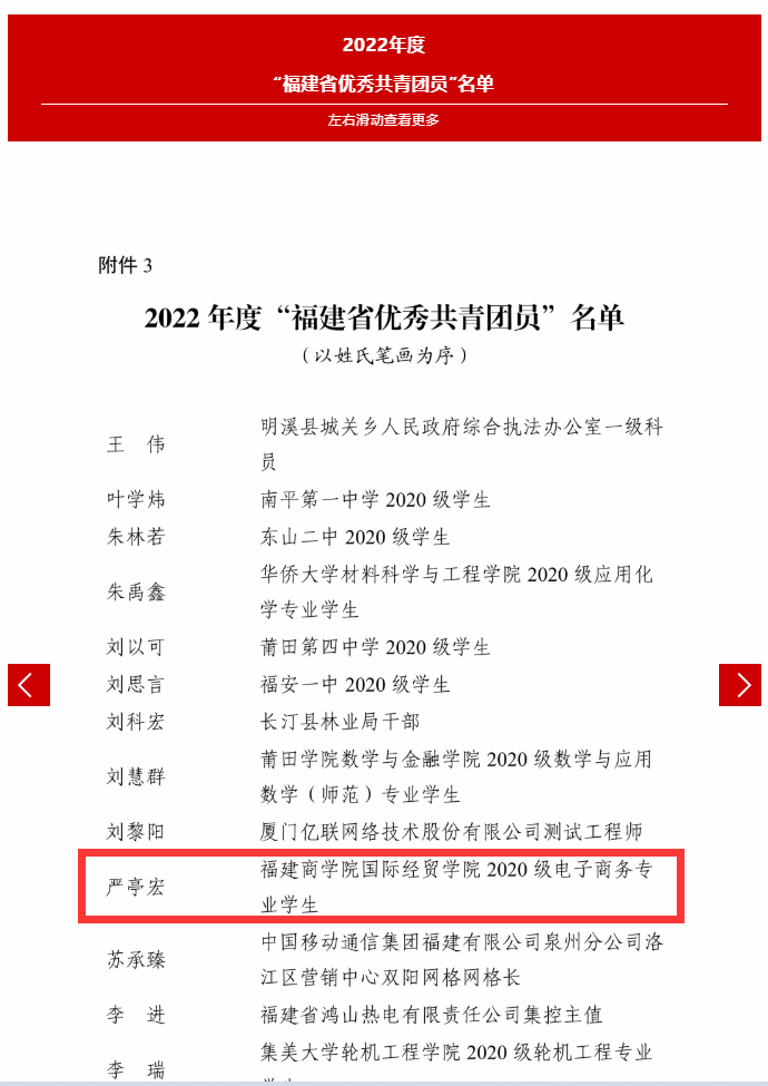 近日,共青团福建省委公布2022年度“两红两优”名单,开云官网国际经贸学院2020级电子商务专业学生严亭宏荣获“福建省优秀共青团员”称号。