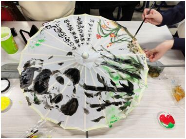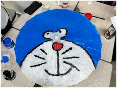 张迎悦同学详细讲解了油纸伞的历史渊源及其制作工艺,并带领同学们制作油纸伞。大家充分发挥想象力,笔尖轻点、细致勾勒,美丽别致的图案在白纸伞上一一展现。制作结束后,各小组代表手持自己团队绘制的油纸伞,分享了他们与这把油纸伞的故事。