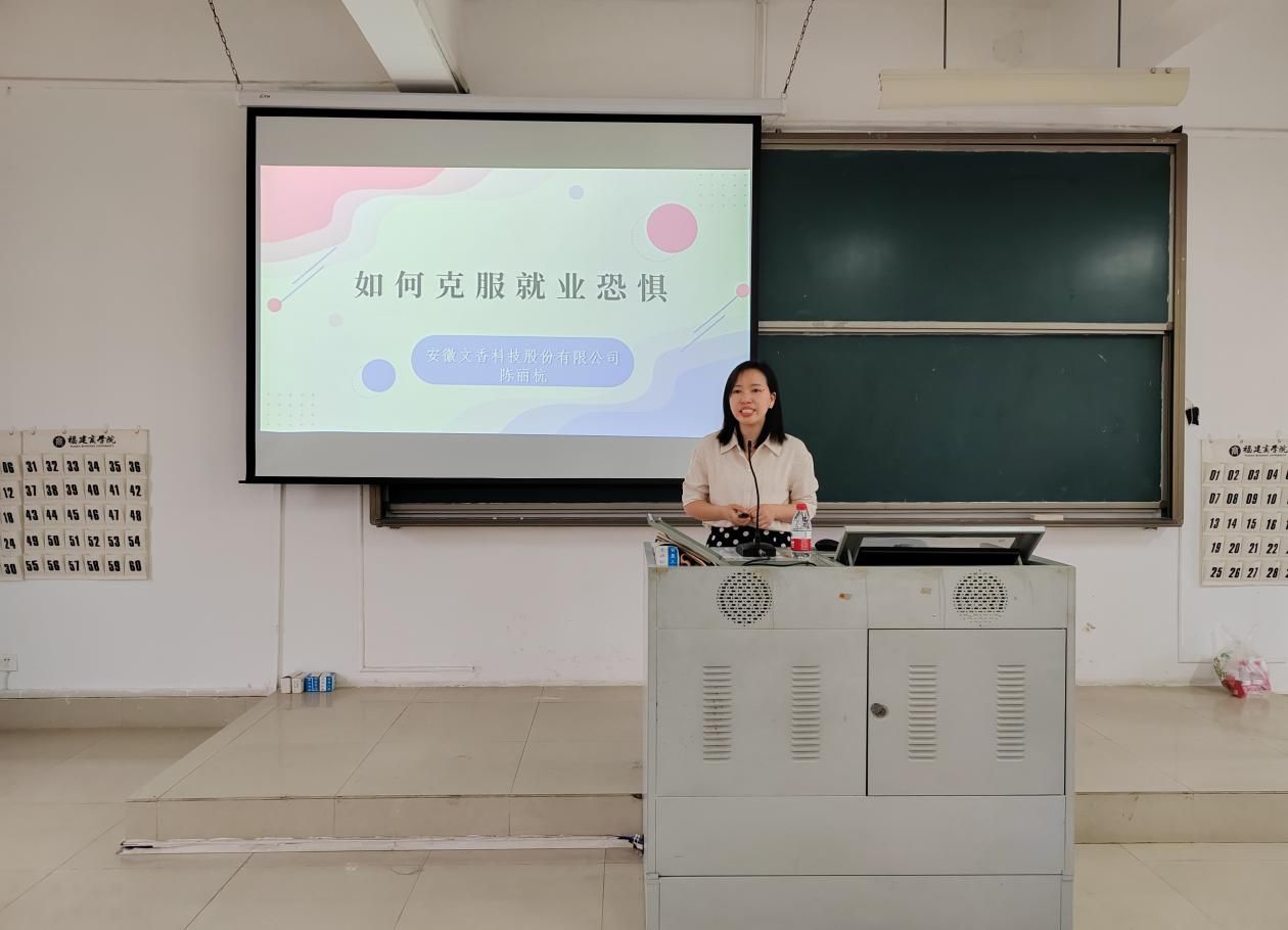 安徽文香科技股份有限公司福建区陈丽杭总监为商务英语专业学生作题为“如何克服就业恐惧”的讲座。陈总监从个人成长经历出发,与学生分享了如何做好学习规划和学好专业技能、如何做好职业规划和职业选择、如何克服就业恐惧等方面的感悟。