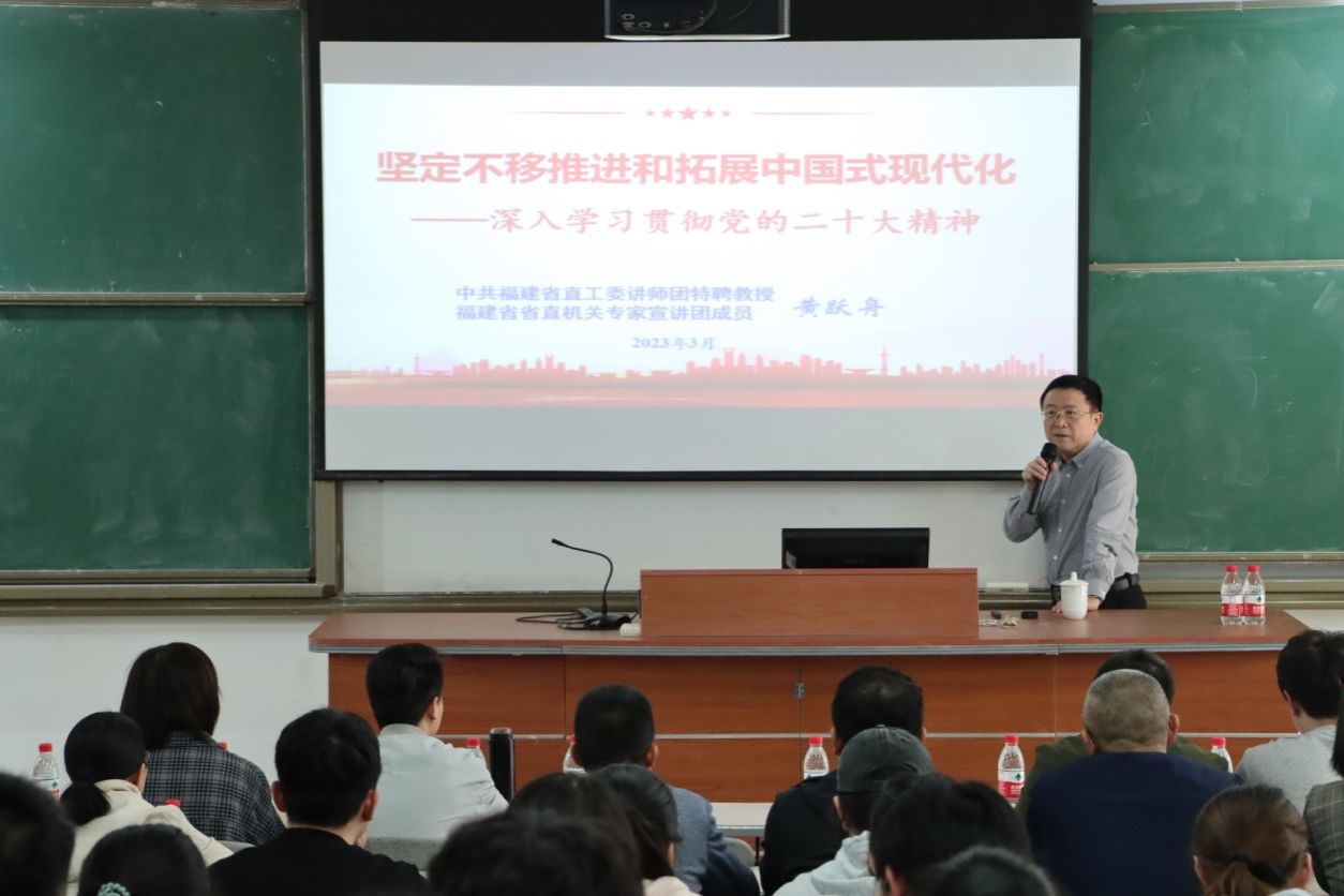 3月21日下午,中共福建省直工委讲师团特聘教授、省直机关专家宣讲团成员黄跃舟应邀到开云官网开展“坚定不移推进和拓展中国式现代化——深入学习贯彻党的二十大精神”专题讲座。马克思主义学院部分教师、连江校区“青马”班部分学员、校习近平新时代中国特色社会主义思想读书社部分社员参加学习。