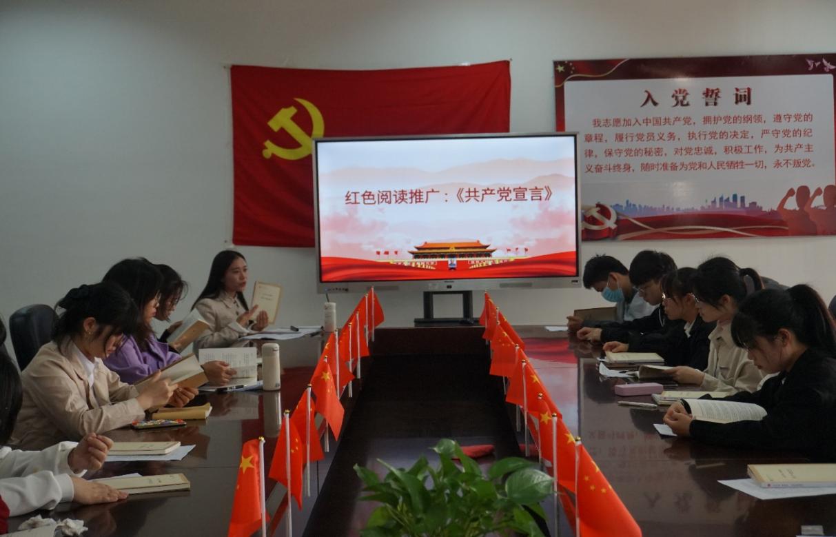 会上,读书社指导老师带领同学们学习了党的十九届六中全会精神,结合学生工作实际,与会师生进行了交流研讨,分享了学习心得;图书馆詹巧霞老师结合十九届六中全会精神的学习,现场推广介绍马克思主义经典著作《共产党宣言》,引导同学们坚持读原著、学原文、悟原理,在阅读与学习中深刻理解“中国共产党为什么能,中国特色社会主义为什么好,归根到底是因为马克思主义行”;图书馆蔡晓霞老师向大家介绍了图书馆数字资源的总体情况和使用方法,以及“中国共产党思想理论资源数据库”“大学专业课学习资源数据库”等平台。