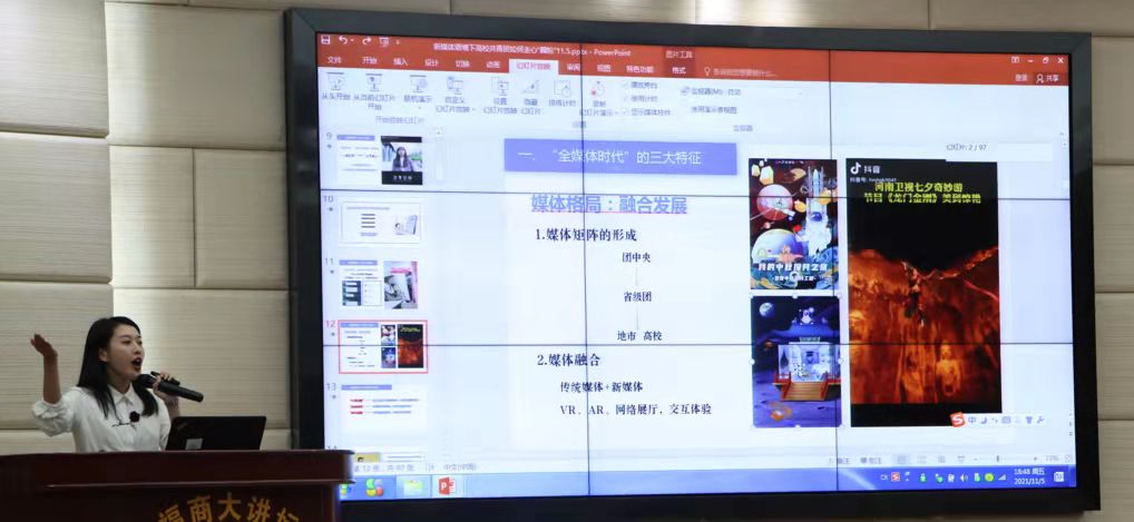 董林老师以启发学生思维为切入点,从全媒体时代的主要特征、各高校新媒体的发展现状及如何提升团学工作的影响力等三个方面进行具体阐述,提出“从‘新’媒体到‘心’媒体”的工作理念,对当前如何在新媒体语境下以“准、精、快、稳”方式吸引受众,实现对青年学生的思想引领提出了有效的方法。