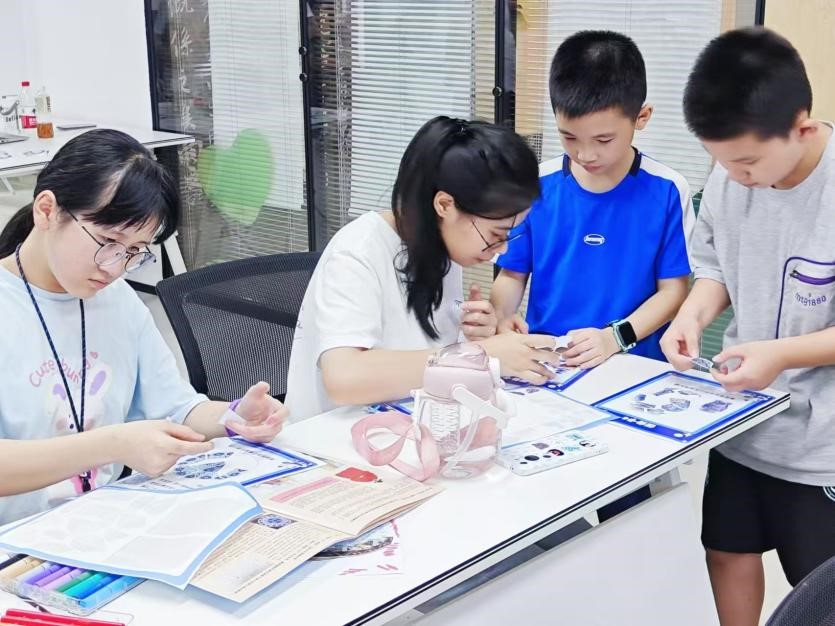 在现场,艺术设计学院学生为社区的孩子们带来了生动有趣的海洋文化知识讲解。幽默风趣的研学故事、丰富多彩的福船制作工艺、别开生面的福建航海文化每一个知识点都让孩子们听得津津有味。艺术设计学院学生与孩子们一起围绕着精心设计的研学任务卡开展活动找不同、连数字、搭船帆、破解有趣的十二生肖密码、设计福船的色彩、模拟航海路线规划、扮演碗礁一号的外销瓷修复师等每一项任务都考验着孩子们的团队协作能力与创新思维。